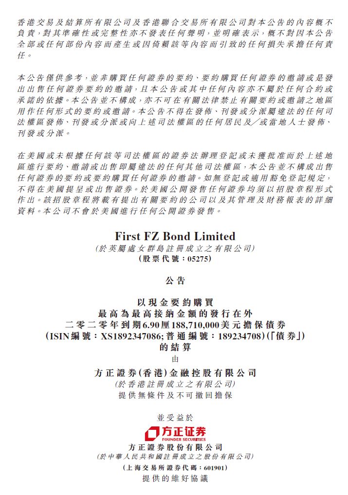 方正證券境外債回購結(jié)算公告